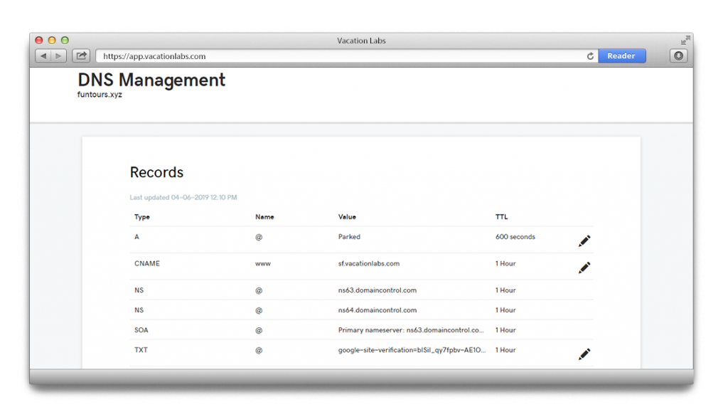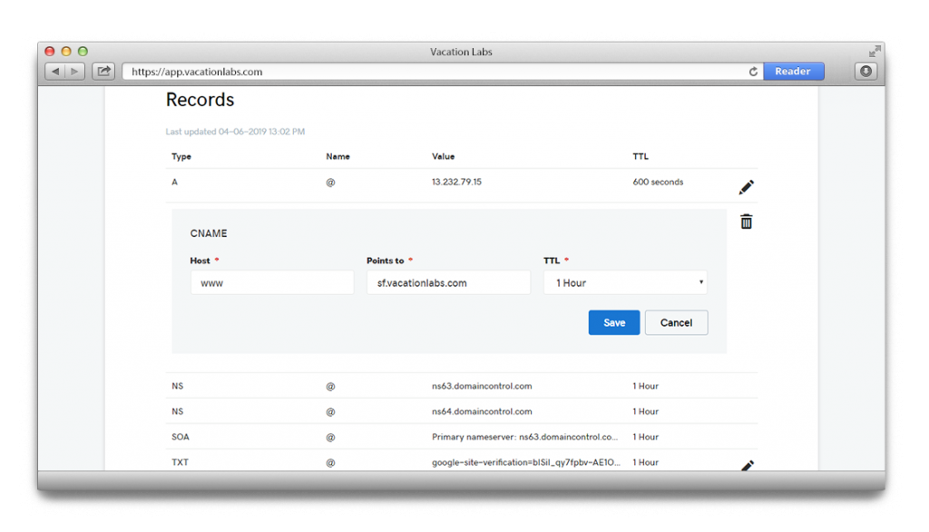 Next, we need to add a CNAME for www.yourdomain.com which points to sf.vacationlabs.com