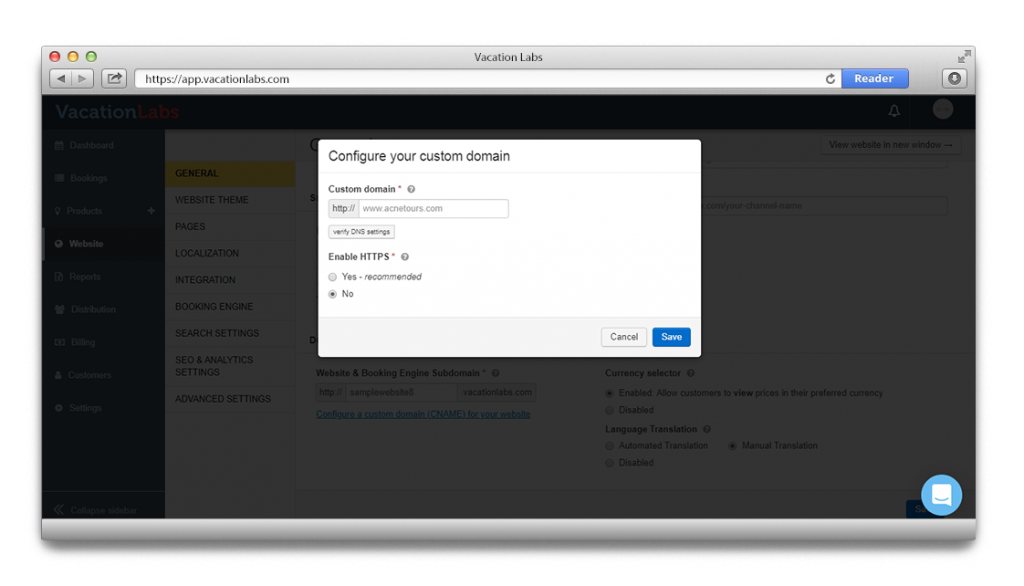 - Once you have added the required DNS records, login to your Vacation Labs account and go to WEBSITE > GENERAL