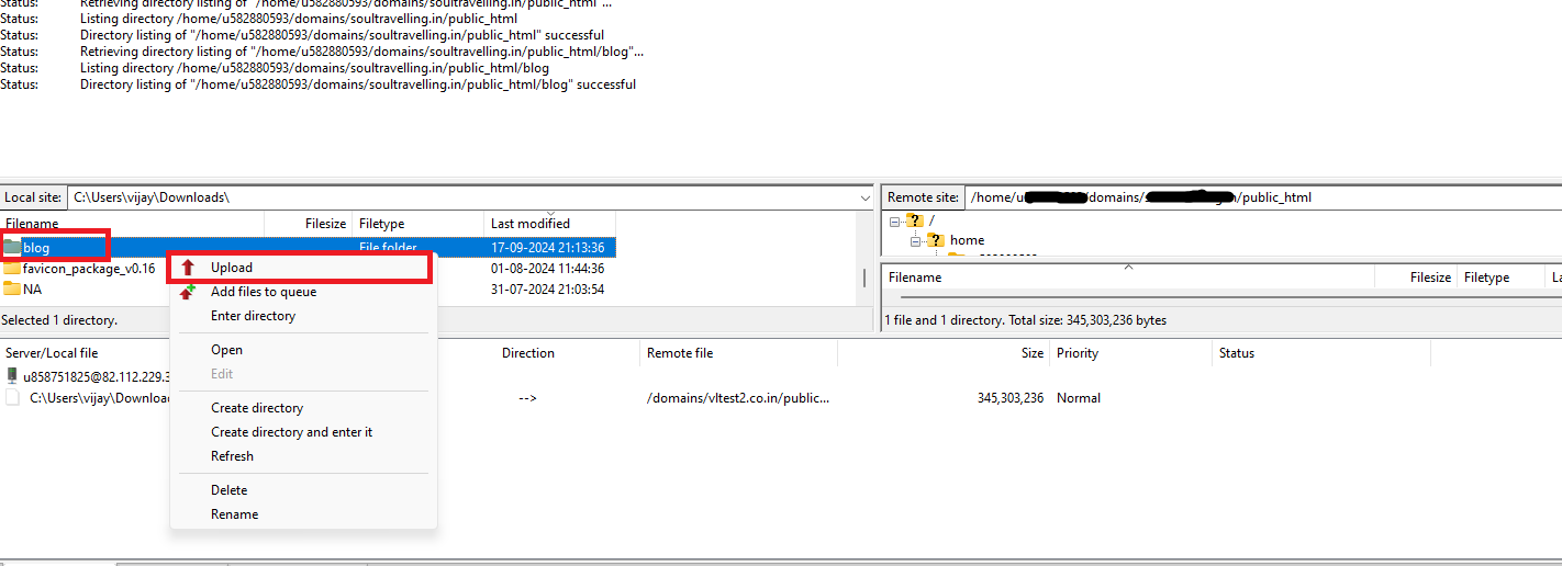 After connecting via SFTP, navigate to the public_html directory under the Remote site: home > uXXXXXXXXX/domains/yourdomain.com/public_html. In the Local site, locate the backup file and find the blog folder. Right-click on the blog folder and select Upload.