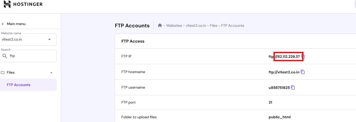 You need to find the IP address of your website. To do this, open Hostinger and search for the DNS Zone Editor or FTP Accounts to locate the IP address.
