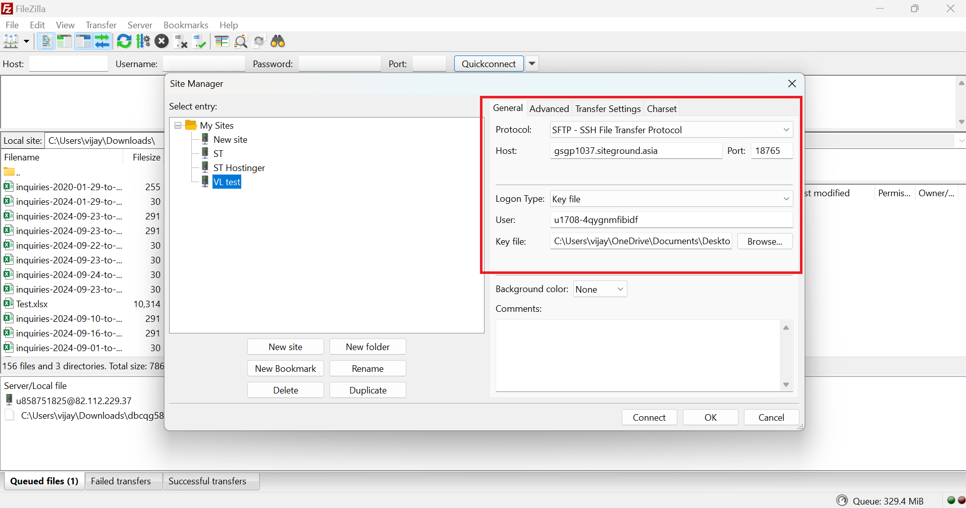 - Open FileZilla and access the files via SFTP. Click on File > Site Manager > Add a Site, select the SFTP method, and enter the SSH values here.