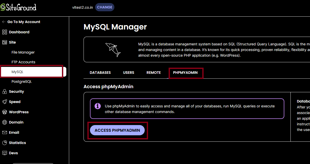 Open SiteGround and locate the website. Click on ‘Site Tools,’ then navigate to Site > MySQL > phpMyAdmin and click on ‘Access phpMyAdmin’
