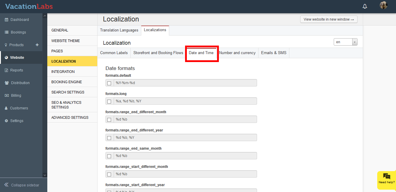 This section allows you to modify the format for Date and Time displayed on your website.