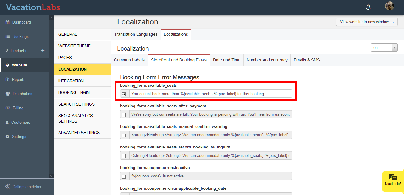 Please note: Never modify the keyword included in {}, for eg %{available_seats}. This are words are used to fetch data from your account and display them on your website. If this are modified there are high chances that this will cause an error on your website.