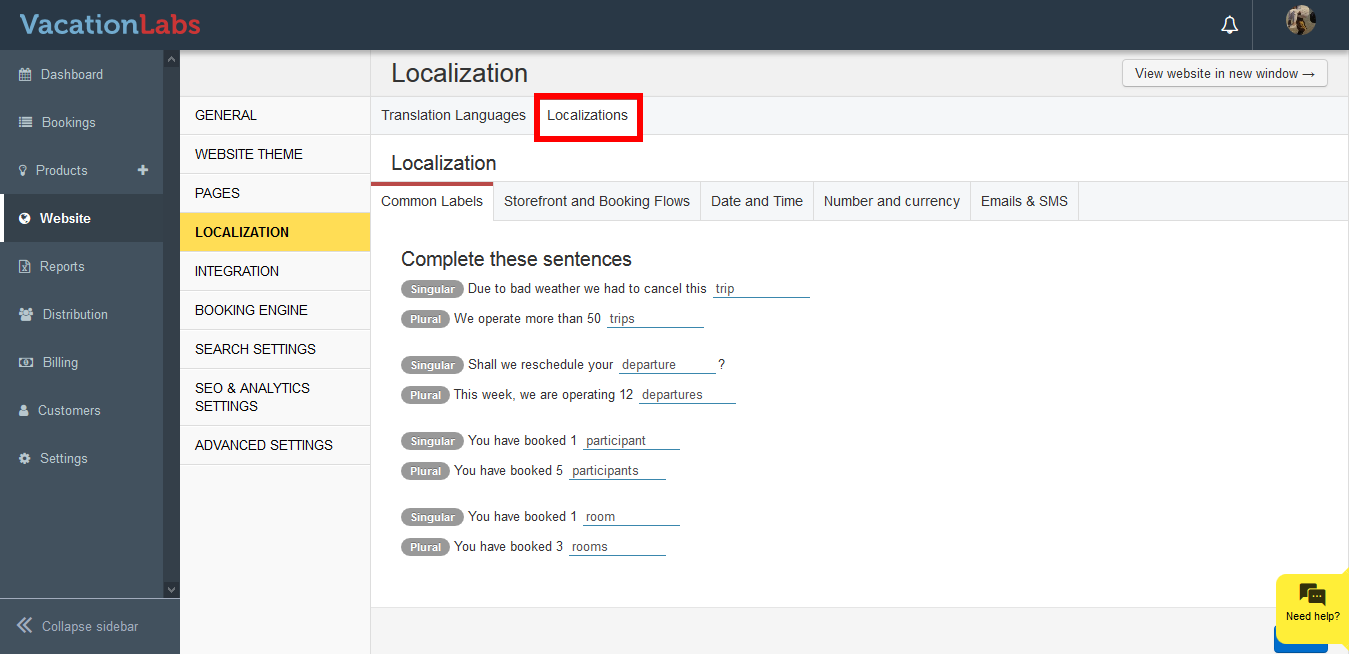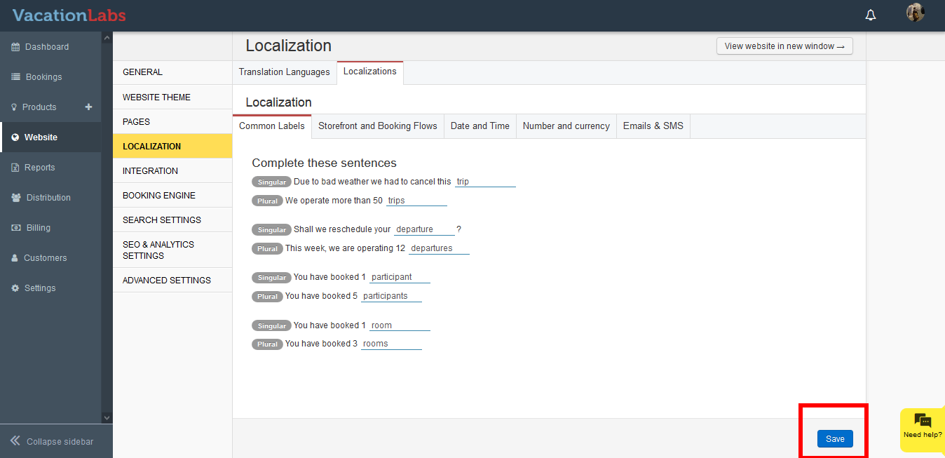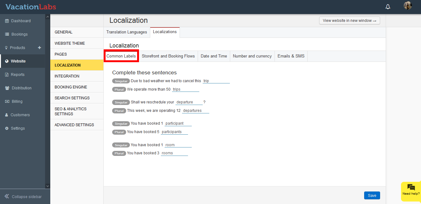 Common labels allows you to edit the basic keywords like Trip, Departure, Participant, etc for both Singular and Plural forms. The changes made here are global and will be modified throughout your website.