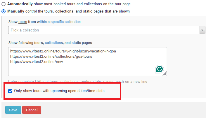 - Automatically: When you create a tour, this option is already chosen for you. It means that the system picks out and shows the most popular tours and collections on the tour page. The system looks at the data to see which tours and collections people book the most. Then, it puts them on the tour details page without you needing to do anything. This saves time because the system keeps updating the page based on what people are booking.