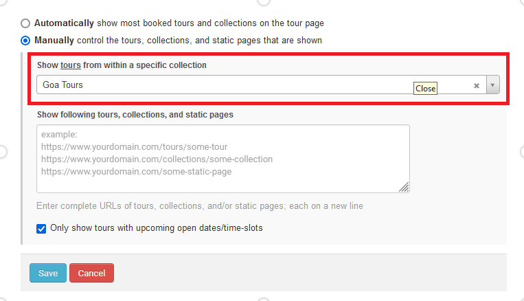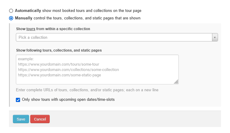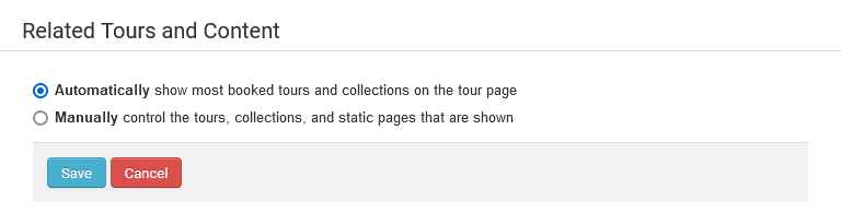 - Manually: You can also choose to configure the related-content on the tour-page sidebar “Manually”. With this, you get to decide exactly which tour, collection, or static page shows up as related-content cards in that particular tour-details page. If you want to control the tours, collections, and static pages that are shown, click on the Manually option.