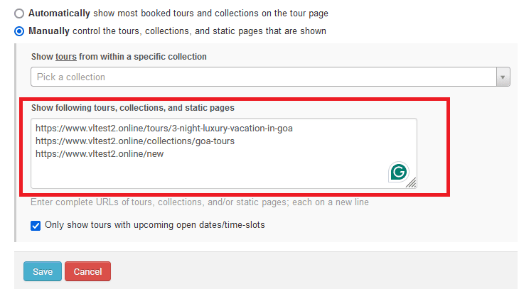 Note: Make sure to enter complete URLs of tours, collections, and/or static pages; each on a new line.