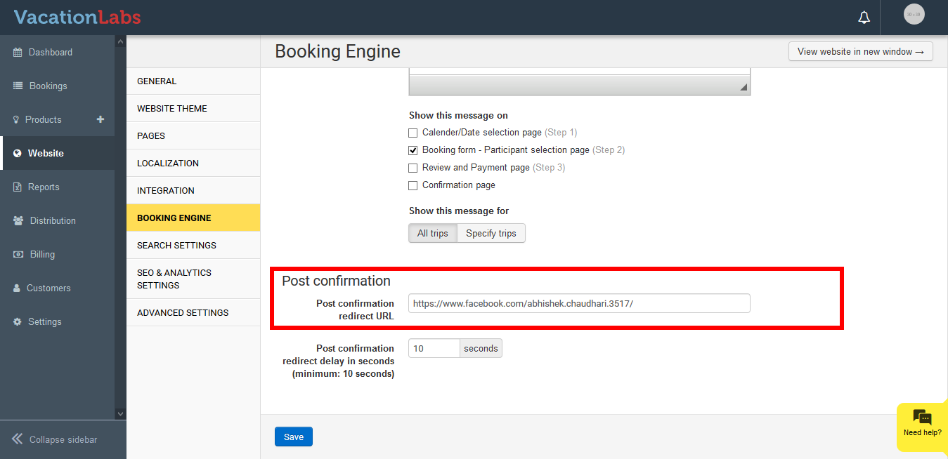 Once a customer completes a purchase, the booking process is over and most likely the user will now leave your website. By using the option to setup a Post confirmation redirect URL you can redirect your customers to visit your Facebook or Instagram page or some other URL within the website.