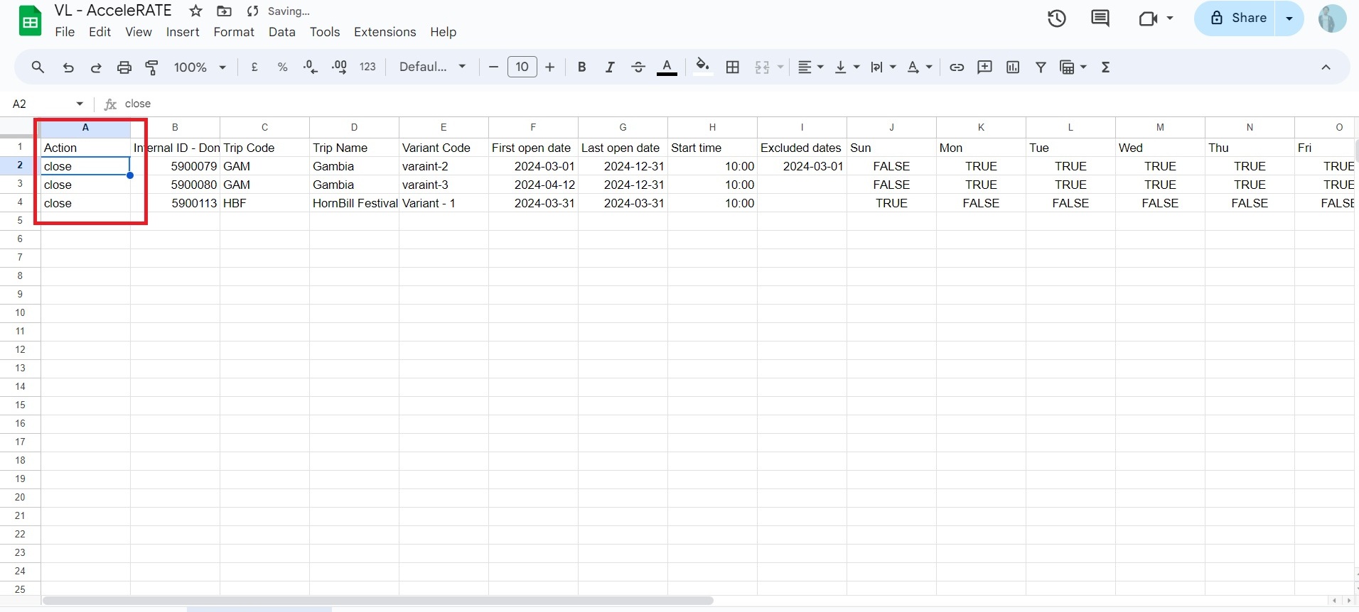 In the sheet, there are columns representing days of the week from Monday to Sunday. You can set these to “true” or “false” to indicate which days the trip should be open. For example, if you set a trip to be open from April 12th to April 30th but mark Saturday and Sunday as “false” in the respective columns, the system will only open the trip on weekdays (Monday through Friday) within the specified date range or vice versa. This allows you to customize the trip’s availability based on specific days of the week, ensuring flexibility in scheduling according to your preferences. (refer screenshot below)