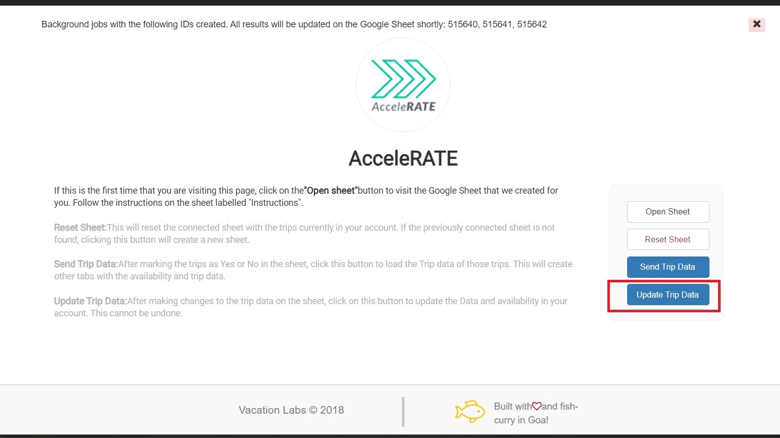 Finally, go back to the Accelerate Plugin Page and click on Update Trip Data (refer screenshot below). This will pull the new data (pricing) from the Google Sheet and update the tour in your Vacation Labs account.