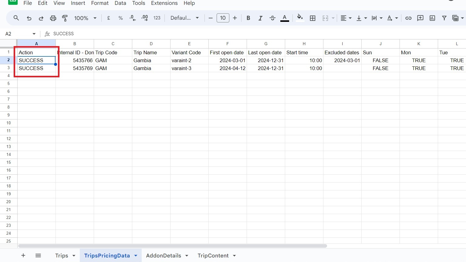1. Once you have clicked on the Update Trip Data button, you will get a SUCCESS text in Column A after a few seconds like this(refer screenshot below), this indicates that the changes have been pushed to the trip