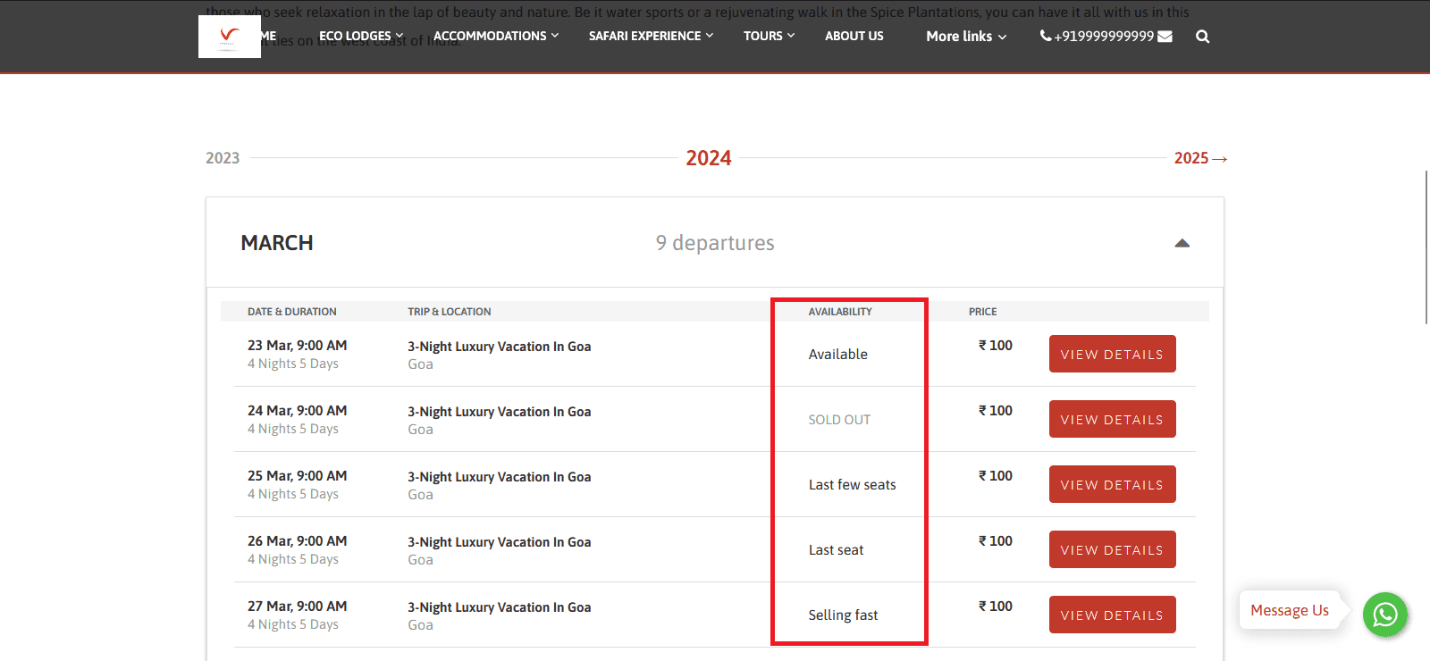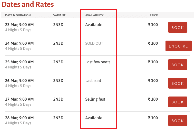 If the Dates and Rates Section addon is enabled for your account, you can display a Dates & Rates Section on the tour details page. In this section, instead of showing available seats, you can display the Urgency Trigger message.