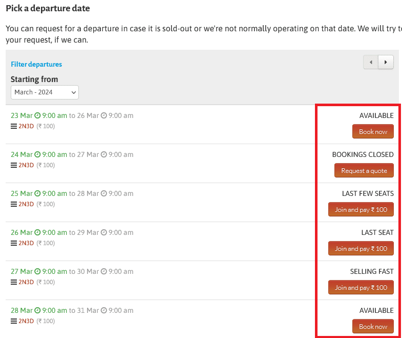 Urgency Triggers allow you to display short messages, like Selling fast or Last seat left at multiple places in the booking flow. This allows you to build a sense of urgency and nudge your customers to complete their bookings sooner. The exact message can be changed as per your requirements. Urgency Triggers are shown at the following places during the booking flow: