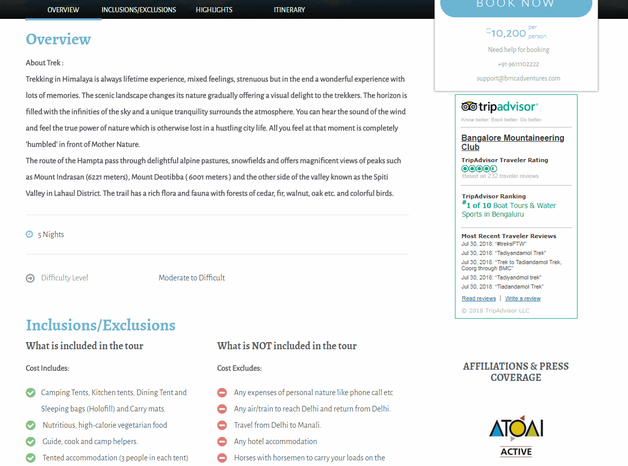 The inclusions, exclusions and highlights offer brief bites of information so visitors are quickly aware of the service on offer.