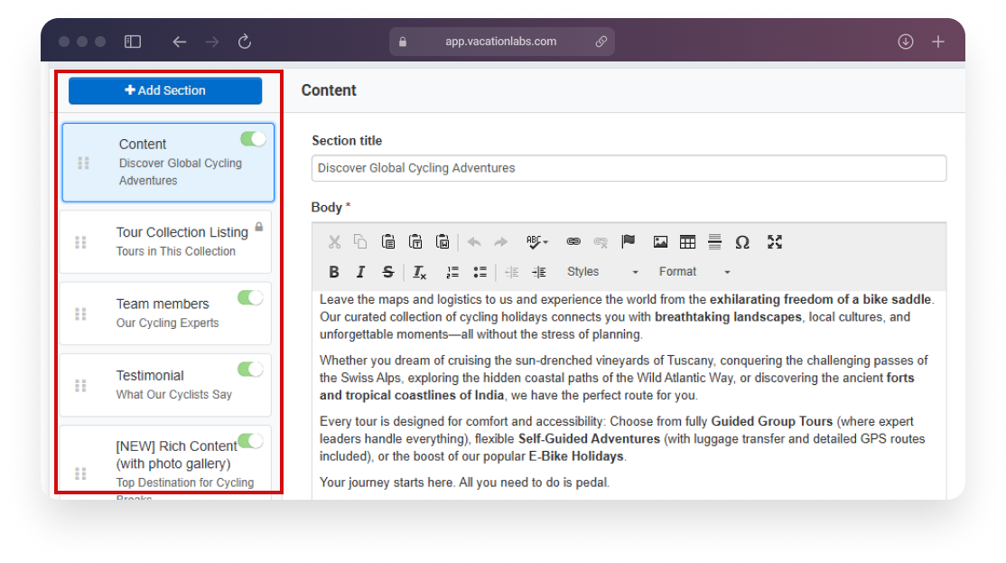 Switching your Collection Page to the new layout creates a new button called Content Sections. From here, you can add additional blocks that were not possible earlier. This can include headings, multiple Tour Cards groups, photo galleries, custom HTML, testimonials, team members, photo galleries, custom HTML, testimonials, team member strips, and more — allowing your Collection Page to tell a more complete story.