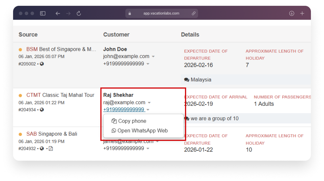 A built-in WhatsApp action lets you instantly message customers with a pre-filled note referencing their inquiry, making it easy to move from inquiry to follow-up in a single click.